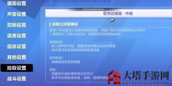 3、在拾取设置中,下拉至物品过滤,调整装备等级筛选,如初级、中级、高级等。