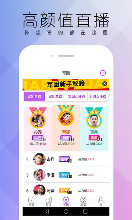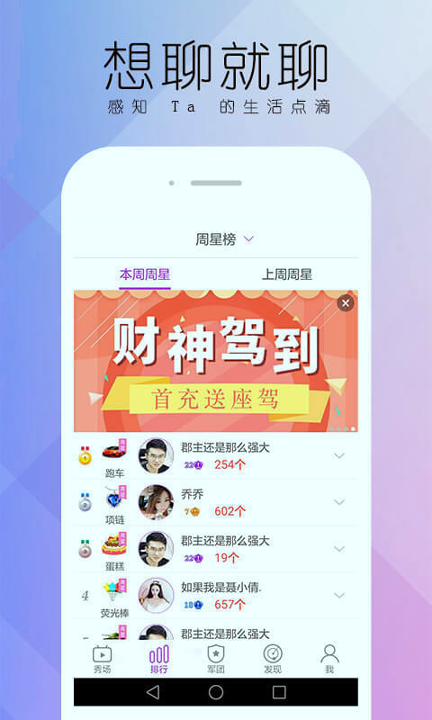 3.在星宇直播中,每个人都可以找到属于自己的一片天。你可以聊天,可以交友,可以唱歌,还可以和新朋友一起开启一场派对。这里不只是一个平台,更是一个新的生活圈,你可以在这里找到你的快乐,找到你的热情,找到你的世界。